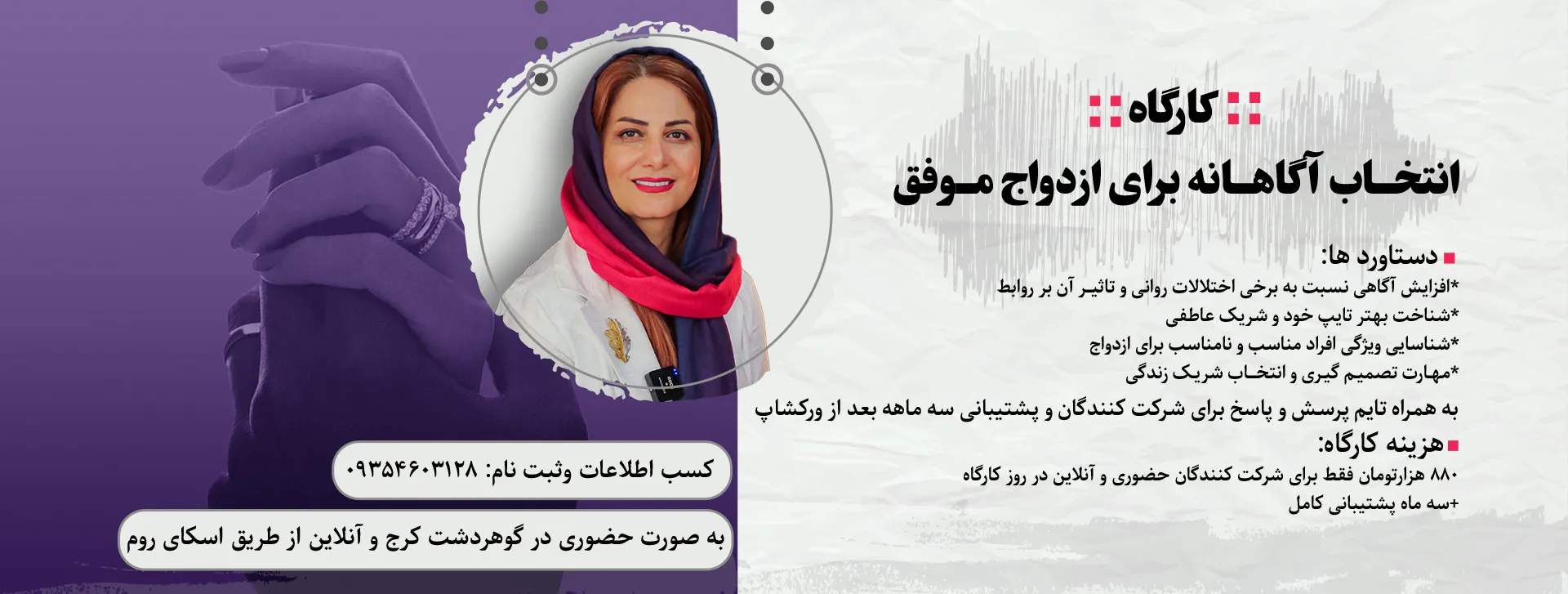 یک پیشنهاد ویژه با شرکت در کارگاه انتخاب آگاهانه هیچ دغدغه ای برای ازدواج نداشته باشید برای اطلاعات بیشتر شماره خود را در کادر زیر وارد نمایید :